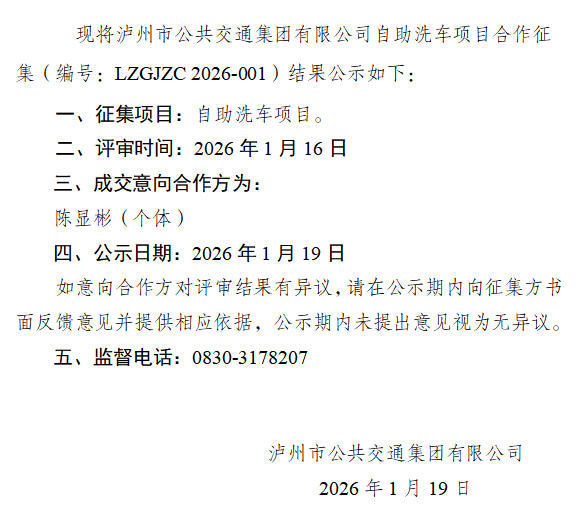 瀘州市公共交通集團有限公司自助洗車項目合作征集結(jié)果公示